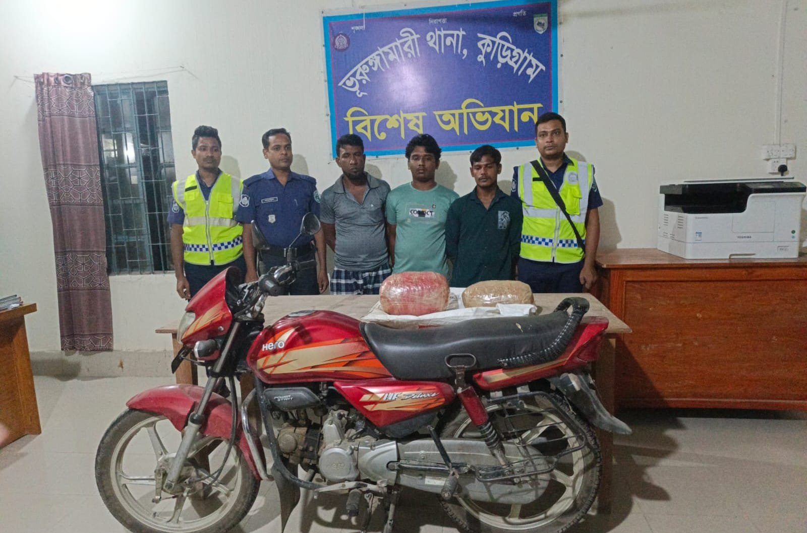 কুড়িগ্রামের ভূরুঙ্গামারীতে ৬ কেজি ভারতীয় গাঁজাসহ শ্বশুর, জামাই ও ভাগ্নেকে আটক করেছে থানা পুলিশ। শুক্রবার (২৫ অক্টোবর) রাত সাড়ে ১২টার দিকে ভূরুঙ্গামারী থানা পুলিশের একটি বিশেষ দল গোপন সংবাদের ভিত্তিতে অভিযান চালিয়ে তাদের গ্রেফতার করে।