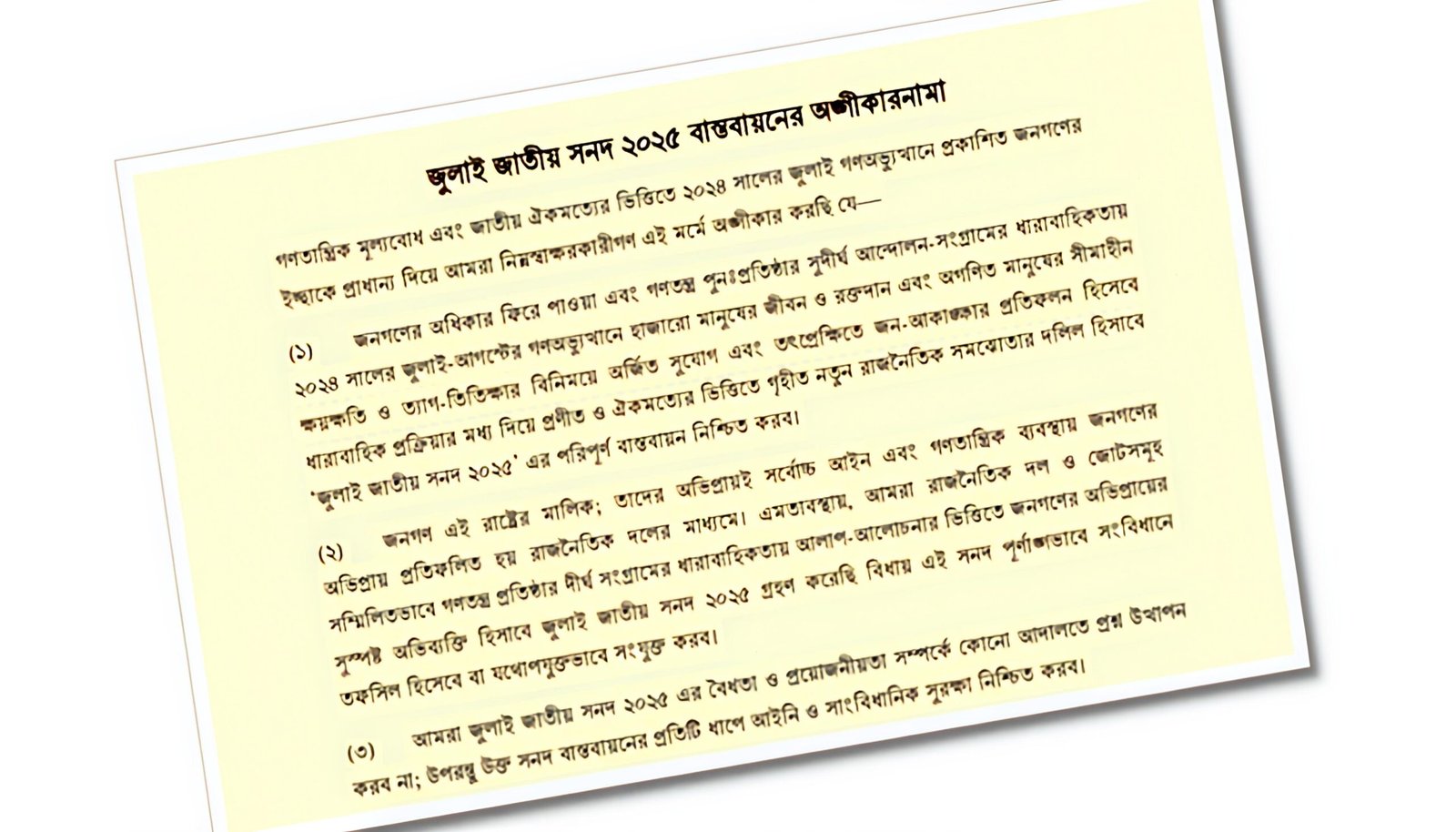 গণতান্ত্রিক মূল্যবোধ এবং জাতীয় ঐকমত্যের ভিত্তিতে ২০২৪ সালের জুলাই গণঅভ্যুত্থানে প্রকাশিত জনগণের ইচ্ছাকে প্রাধান্য দিয়ে আমরা নিম্নস্বাক্ষরকারীগণ এই মর্মে অঙ্গীকার করছি যে–