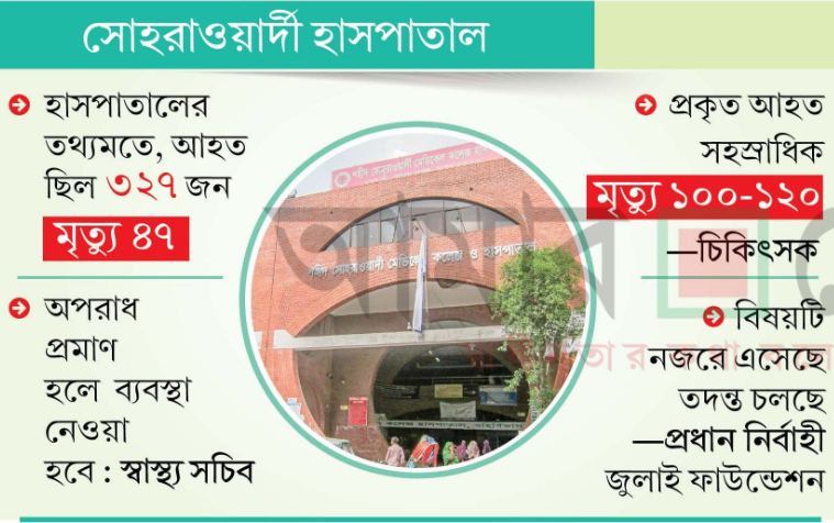 জুলাই বিপ্লবের সময় হতাহতদের বড় একটি অংশকে যে কয়টি সরকারি হাসপাতালে নেওয়া হয়, রাজধানীর শহীদ সোহরাওয়ার্দী মেডিকেল কলেজ হাসপাতাল তার মধ্যে একটি। হাসপাতালের তথ্যমতে, এখানে ২০২৪ সালের ১৫ জুলাই থেকে ১০ আগস্ট পর্যন্ত তিন শতাধিক আহত এবং ৪৭ জনের মৃত্যু রেকর্ড করা হয়। তবে ভিন্ন কথা বলছেন বিপ্লবের উত্তাল সময়ে চিকিৎসাসেবা দেওয়া চিকিৎসক ও নার্সরা। প্রকৃত হতাহতের সংখ্যা হাসপাতাল কর্তৃপক্ষের দেওয়া তথ্যের চেয়ে দুই থেকে তিনগুণ বেশি বলে জানাচ্ছেন তারা।