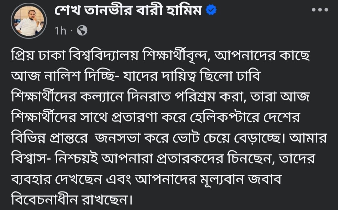 শনিবার (২৯ নভেম্বর) রাত এগারোটা নাগাদ নিজের ভেরিফাইড ফেসবুক আইডি থেকে এ স্ট্যাটাস দেন তিনি। সেখানে ডাকসু নেতাদের উদ্দেশ্যে তিনি বলেন, ‘প্রিয় ঢাকা বিশ্ববিদ্যালয় শিক্ষার্থীবৃন্দ, আপনাদের কাছে আজ নালিশ দিচ্ছি- যাদের দায়িত্ব ছিলো ঢাবি শিক্ষার্থীদের কল্যানে দিনরাত পরিশ্রম করা, তারা আজ শিক্ষার্থীদের সাথে প্রতারণা করে হেলিকপ্টারে দেশের বিভিন্ন প্রান্তরে  জনসভা করে ভোট চেয়ে বেড়াচ্ছে। আমার বিশ্বাস- নিশ্চয়ই আপনারা প্রতারকদের চিনছেন, তাদের ব্যবহার দেখছেন এবং আপনাদের মূল্যবান জবাব বিবেচনাধীন রাখছেন।’