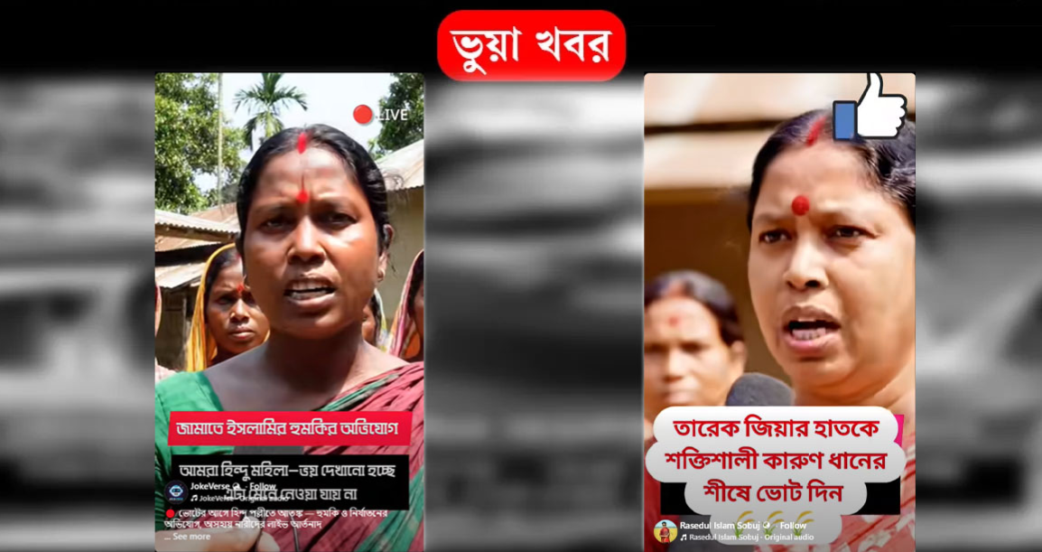 ‘দাঁড়িপাল্লায় ভোট না দিলে আমাদেরকে ইন্ডিয়াতে পাঠানোর ভয় দেখাচ্ছে জামাত ইসলাম, কিন্তু আমরা সবাই ধানের শীষে ভোট দিব’—একজন হিন্দু ধর্মাবলম্বী নারী এভাবে আতঙ্কের কথা বলছেন এমন একটি ভিডিও সামাজিক যোগাযোগমাধ্যমে ছড়িয়ে পড়েছে। ফেসবুকে বিএনপি সংশ্লিষ্ট বিভিন্ন গ্রুপেও পোস্ট করা হয়েছে ভিডিওটি।