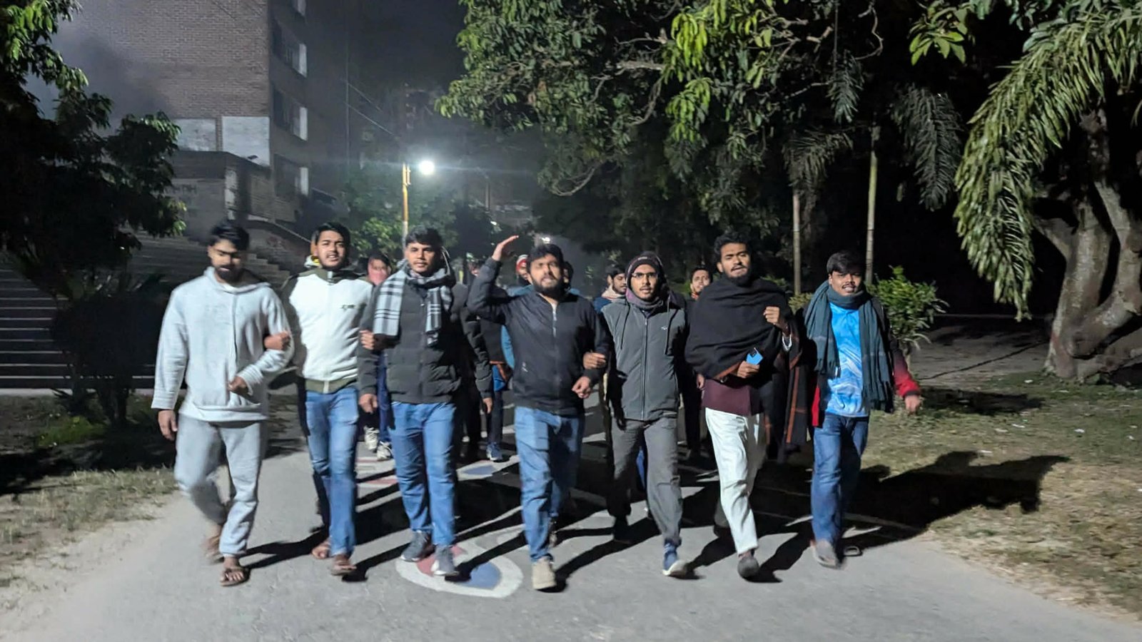 বুধবার (৭ জানুয়ারি) রাত সোয়া বারোটার দিকে বিশ্ববিদ্যালয়ের জিয়া মোড় থেকে মিছিল বের হয়ে ক্যাম্পাসের বিভিন্ন সড়ক প্রদক্ষিণ করে প্রধান ফটকে সমবেত হয়। পরে সেখানে সংক্ষিপ্ত সমাবেশ অনুষ্ঠিত হয়। এসময় ‘নারায়ে তাকবির, আল্লাহু আকবর; তাকবির হবে ক্যাম্পাসে, তাকবির হবে সংসদে; শ্লোগানে এলার্জি যার, যা তারা ক্যাম্পাস ছাড়’ ইত্যাদি স্লোগান দিতে দেখা যায়।