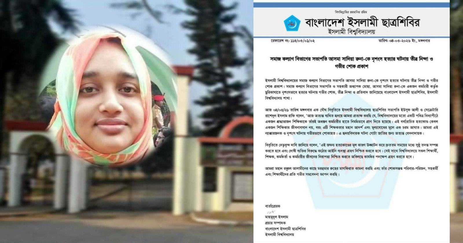 ইসলামী বিশ্ববিদ্যালয়ের (ইবি) সমাজকল্যাণ বিভাগের সভাপতি ও সহকারী অধ্যাপক আসমা সাদিয়া রুনাকে নিজ কার্যালয়ে নৃশংসভাবে হত্যার ঘটনায় তীব্র নিন্দা ও গভীর শোক প্রকাশ করেছে বিশ্ববিদ্যালয় শাখা ছাত্রশিবির।