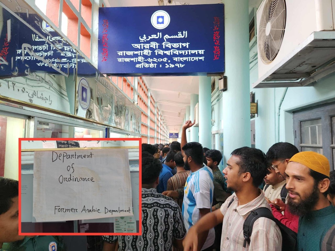 সরেজমিনে দেখা যায়, প্রধান ফটকসহ সব কক্ষে তালা ঝুলছে। নোটিশ বোর্ডে সাঁটানো হয়েছে সেই ব্যঙ্গাত্মক ব্যানার। ব্যানারে লেখা, ‘ডিপার্টমেন্ট অব অর্ডিন্যান্স, ফরমার আরবি ডিপার্টমেন্ট’।